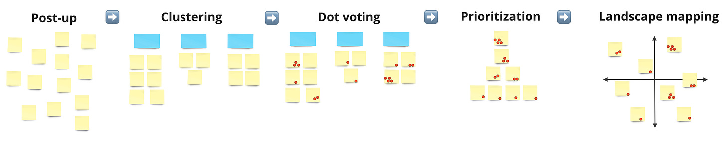 Clustering is also known as “affinity mapping” and is the grouping of information into relational groups based on similarities and themes. Clustering is the perfect exercise to be done right after a “post-up”.