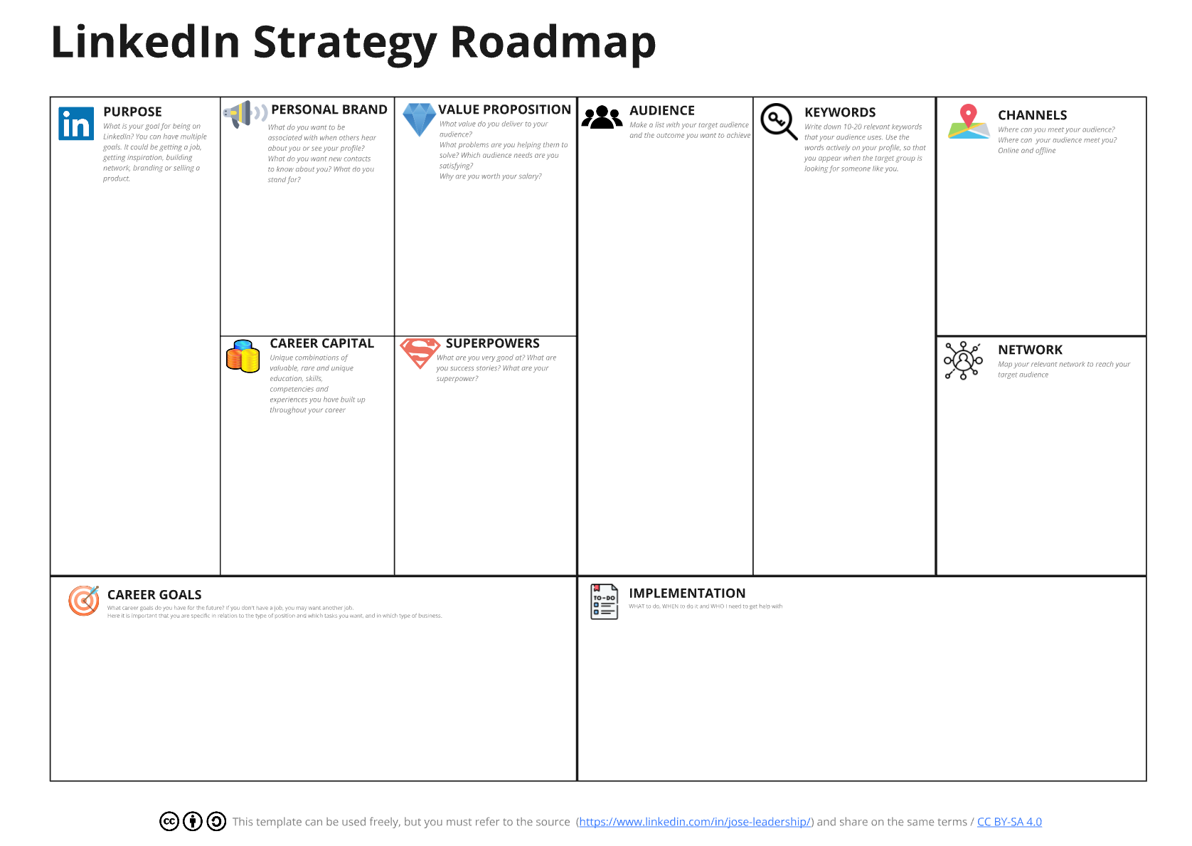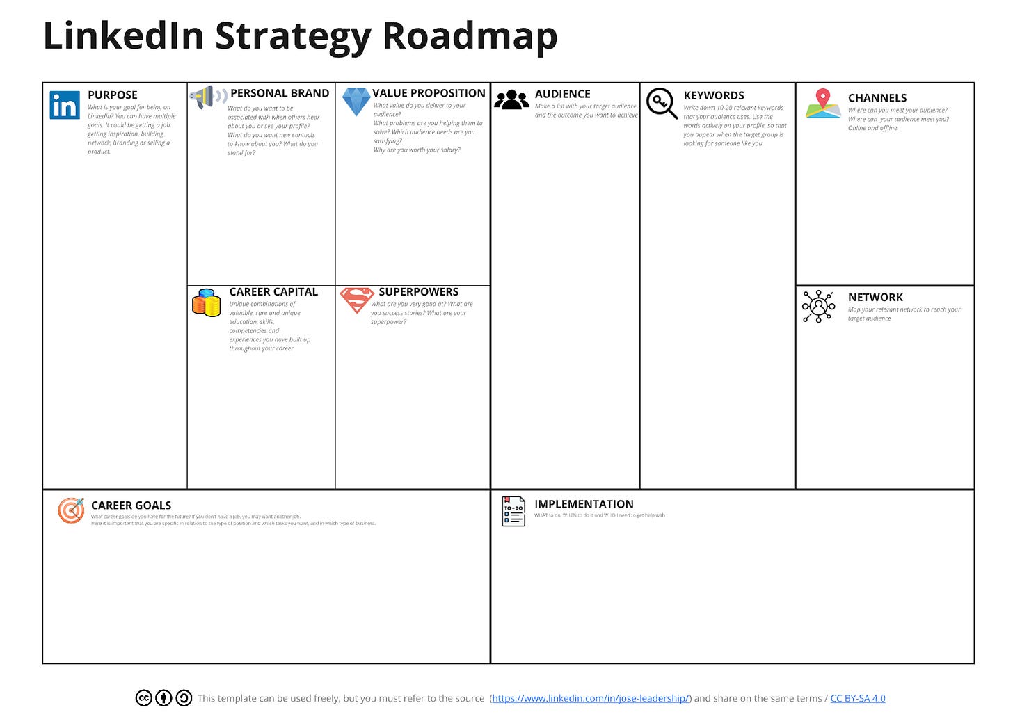 One way to build strong relationships on LinkedIn is by using the LinkedIn Strategy Roadmap. The roadmap should be used as a brainstorming board to help you come up with aspects of your personal brand. So that you can work purposefully with LinkedIn.
