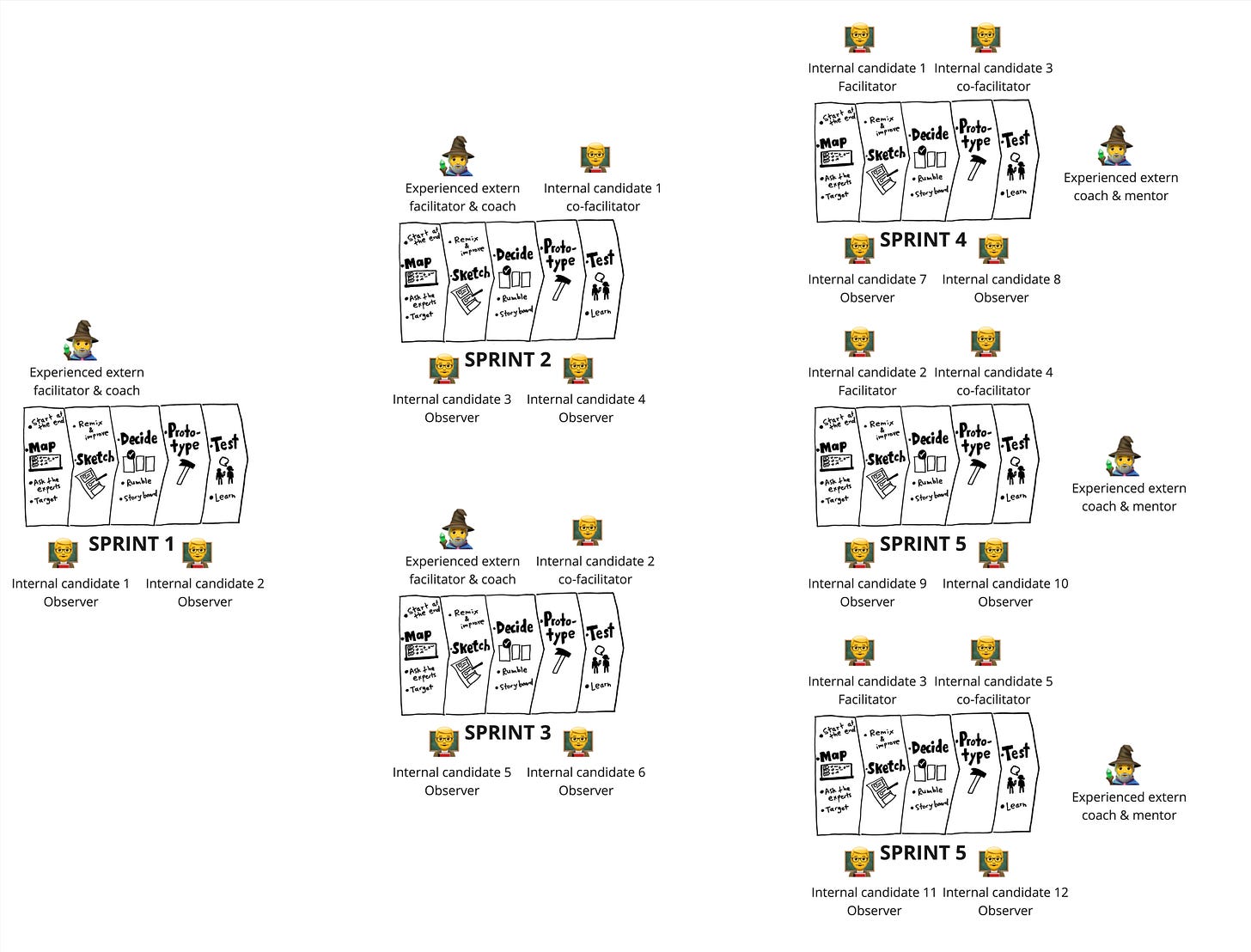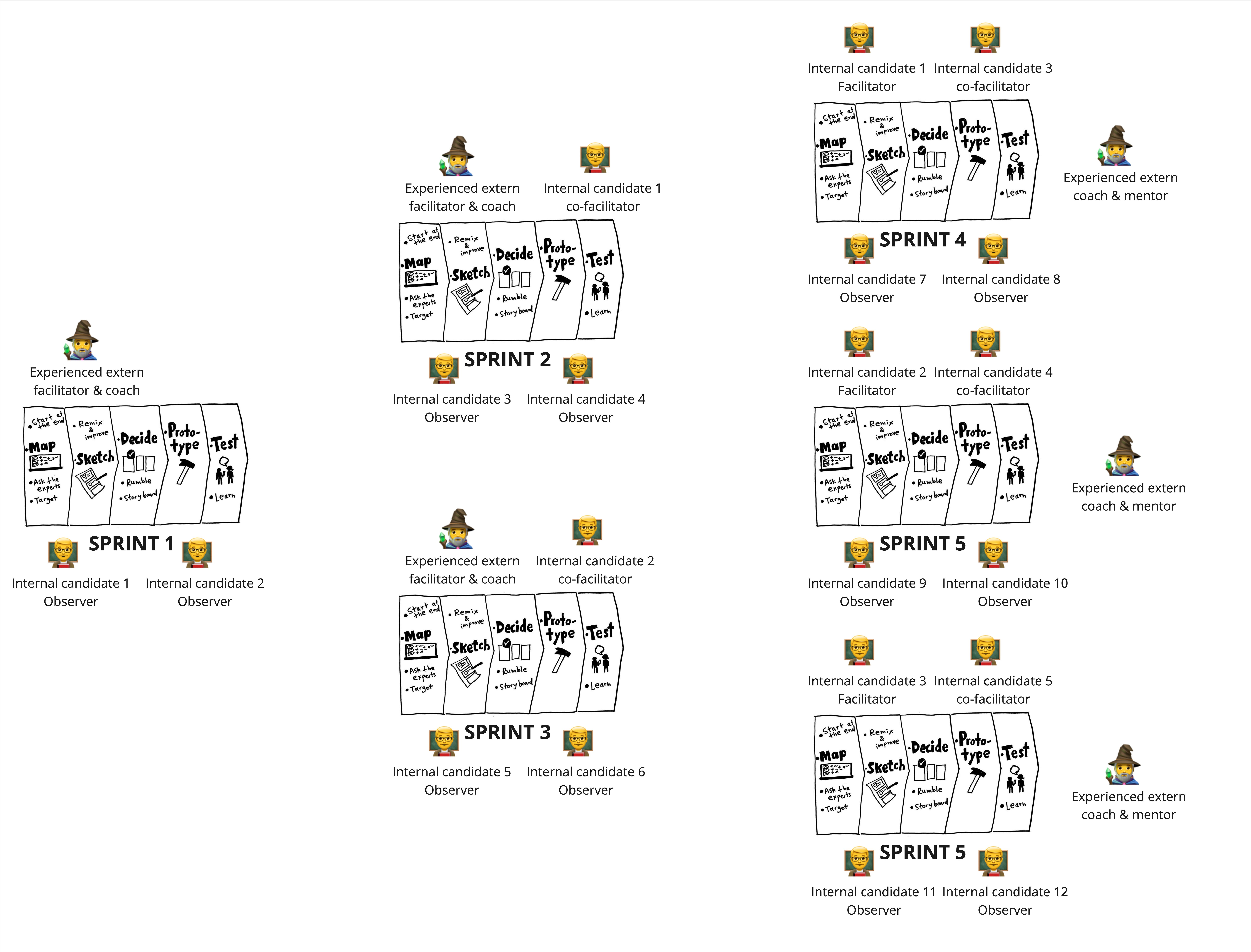 Through a series of real Design Sprints in your organization, future facilitators get involved and gradually take on more responsibility for planning, preparing, carrying out and summarizing Design Sprints.