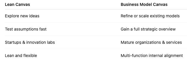 In my work with innovation teams, we start with the Lean Canvas to validate assumptions quickly. Once we gain traction, we transition to the Business Model Canvas to refine the business model for operationalization and scaling.