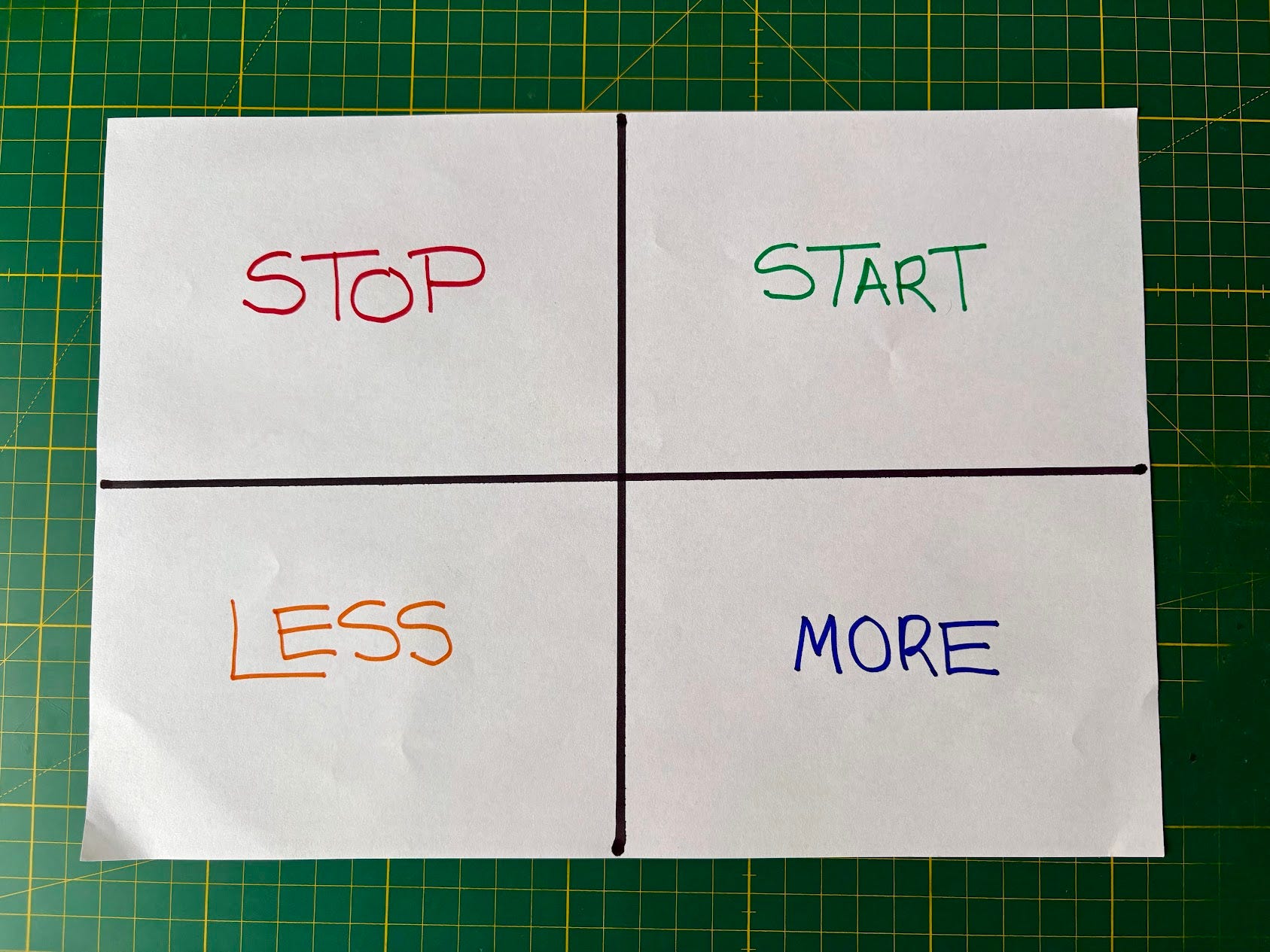 One of my favorite workshop tools to bring clarity and alignment is the simple yet powerful exercise: “Stop, Start, Less, More.”