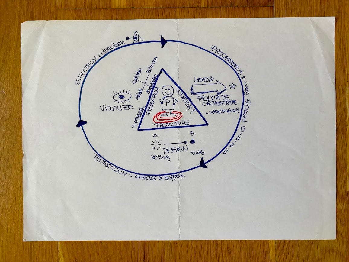 At the center, there’s a human. Around that human: insight, research, prototyping. And surrounding all of it: strategy, processes, and technology.